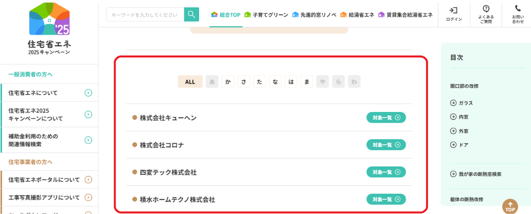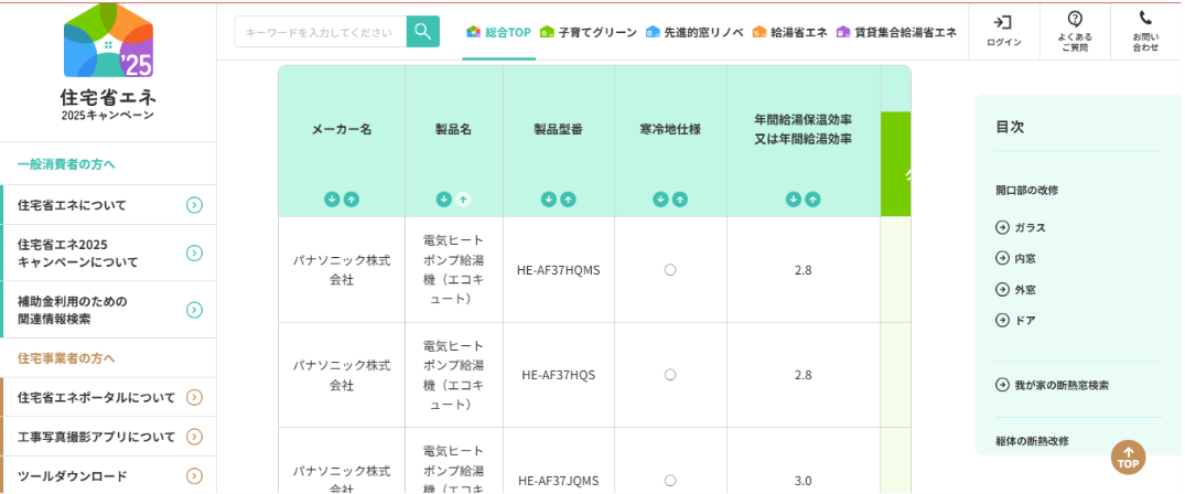 指定したメーカーの、補助対象となっている製品一覧が表示されます。こちらに表示された製品はすべて補助対象となっています。