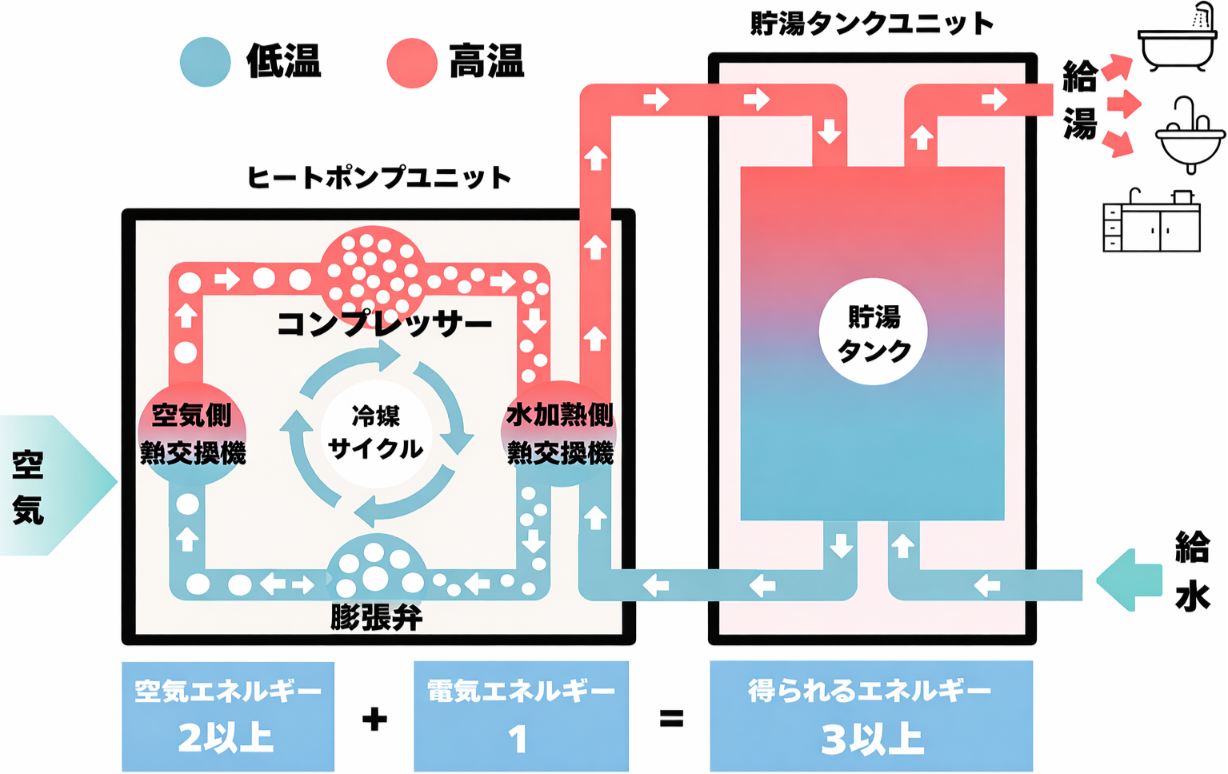 - ヒートポンプユニット…外気の熱を吸収し、冷媒を圧縮して高温化し、その熱で水を加熱する。