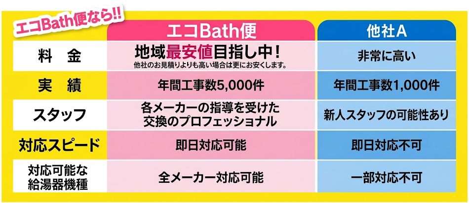 エコBath便なら、料金、実績、スタッフ、対応スピード、給湯器機種、すべて自信があります!